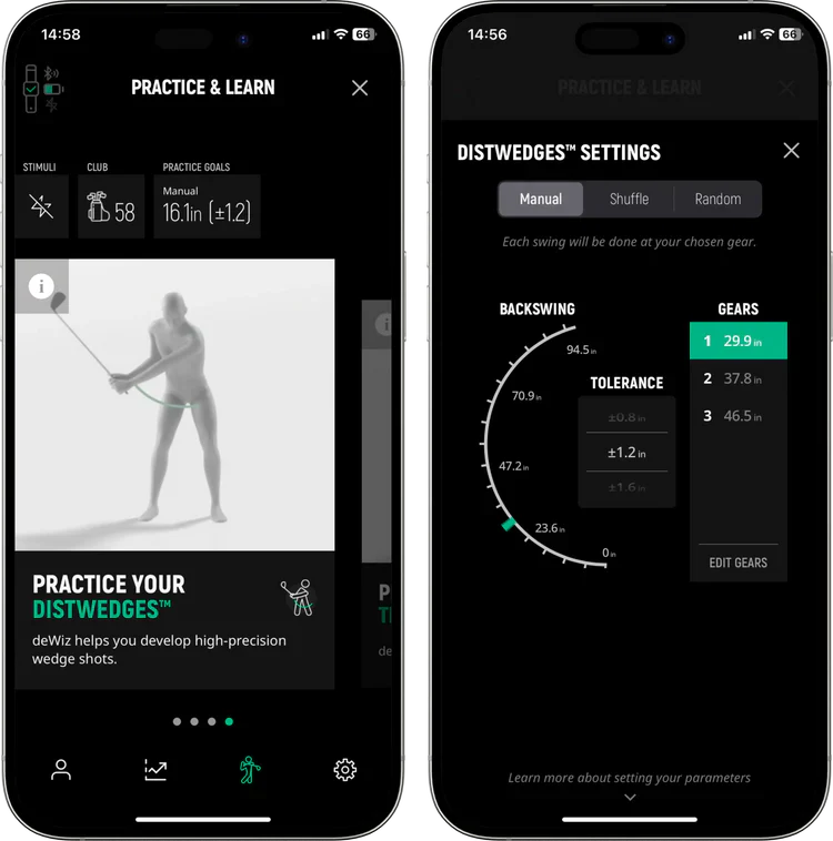 deWiz DistWedges refers to different swing lengths as “Gears”. We suggest to gap your gears by 8 inches/20 centimeters and start with working on three different swing lengths. Start with your full wedge swing length and use that Length of Backswing to gap your two other gears.