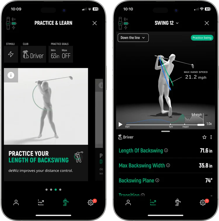 Take your practice to the next level with the help of the patented deWiz Learning Stimuli. Ensure that you are successfully making a longer golf swing by setting practice goals within the deWiz app and receiving the Learning Stimuli feedback if your swing doesn’t reach that set threshold.